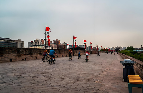 Afternoon to visit Ancient City Wall, the fortifications of Xi'an, represent one of the oldest, largest and best preserved Chinese city walls. It was built under the rule of the Hongwu Emperor Zhu Yuanzhang as a military defense system. It exhibits the "complete features of the rampart architecture of feudal society". It has been refurbished many times since it was built in the 14th century, thrice at intervals of about 200 years in the later half of the 1500s and 1700s, and in recent years, 1983. The wall encloses an area of about 14 square kilometres (5.4 sq mi).