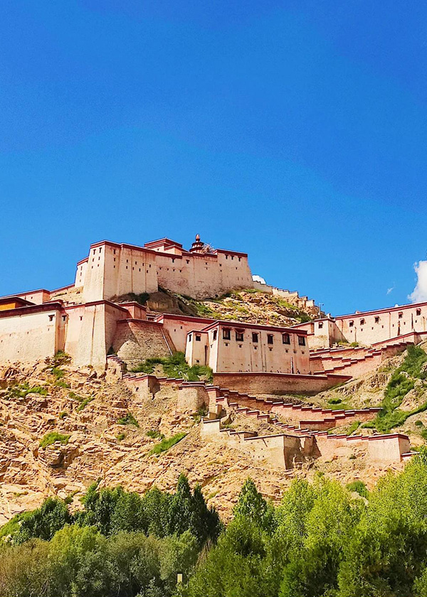 Then head to Old Town and Gyantse Castle with the Dzong Fortress, one of the best preserved dzongs in Tibet, perched high above the town of Gyantse on a huge spur of grey brown rock. According to Vitali, the fortress was constructed in 1390 and guarded the southern approaches to the Tsangpo Valley and Lhasa. The town was surrounded by a wall 3 kilometres (1.9 mi) long. The entrance is on the eastern side.