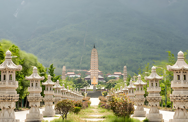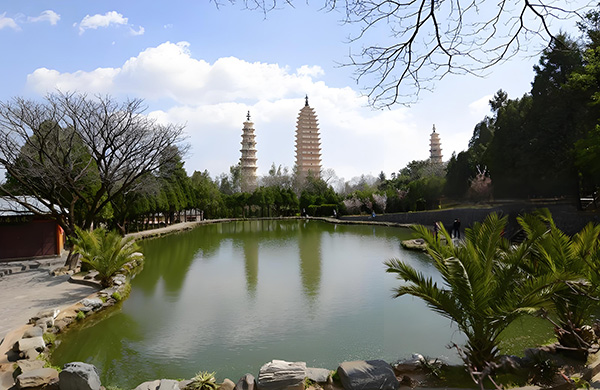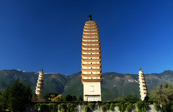 Proceed to visit the Three pagodas of Chongsheng Temple are an ensemble of three independent pagodas arranged on the corners of an equilateral triangle, dating from the time of the Kingdom of Nanzhao and Kingdom of Dali in the 9th and 10th centuries.