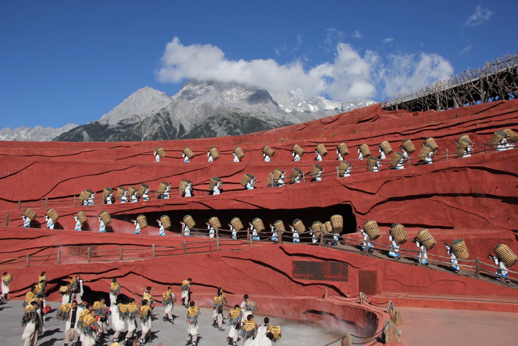 Over 500 residents from 10 different ethnic groups, hailing from 16 towns and villages around Lijiang, perform rituals, dances and folk songs for visitors daily, weather permitting, against the enchanting scenery as a backdrop.